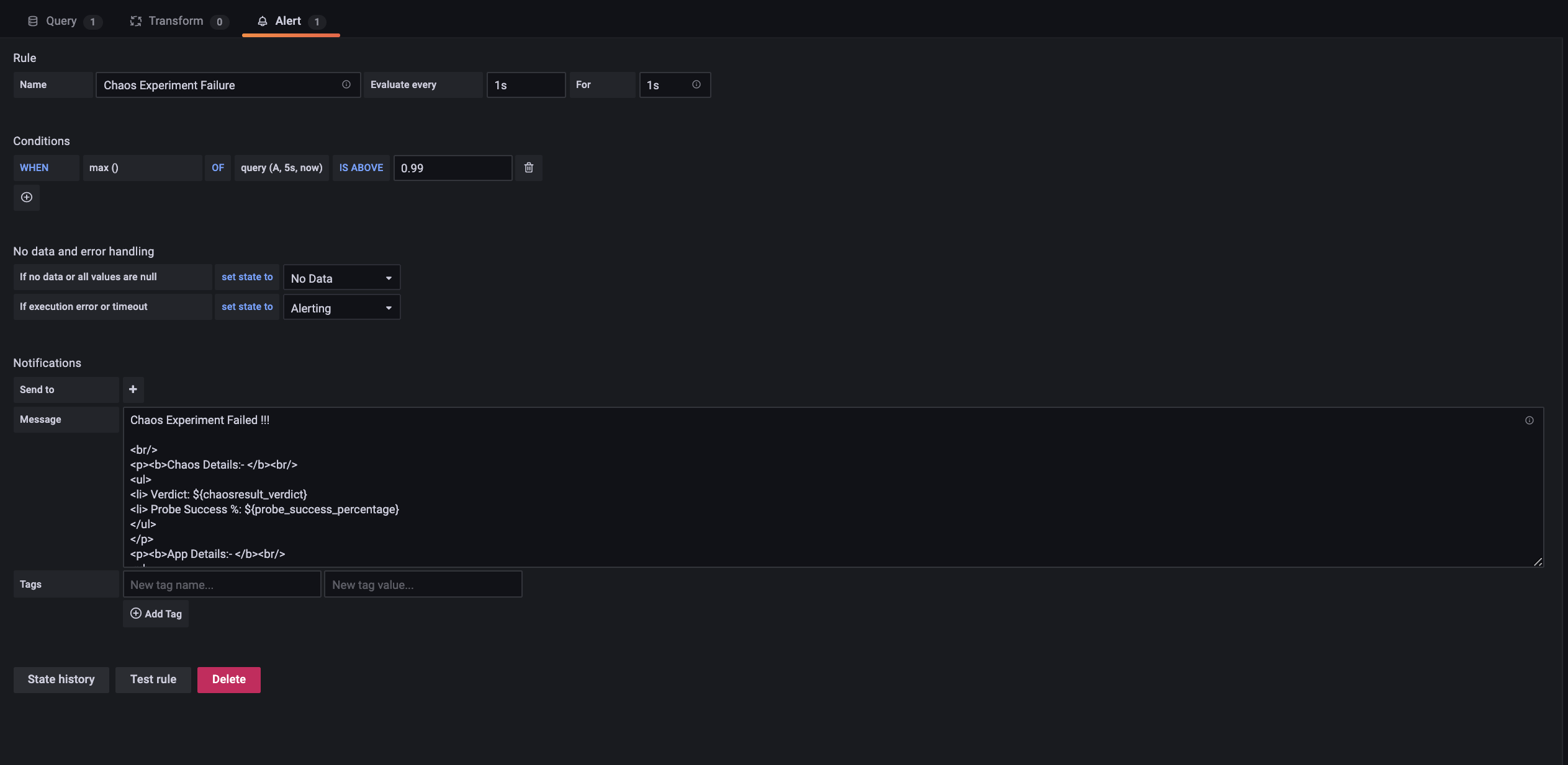 These alerts can be configured and triggered based on conditions set on panels using the litmuschaos_awaited_experiments and litmuschaos_experiment_verdict metrics. The same can be issued to various channels registered for the corresponding alerts on Grafana.