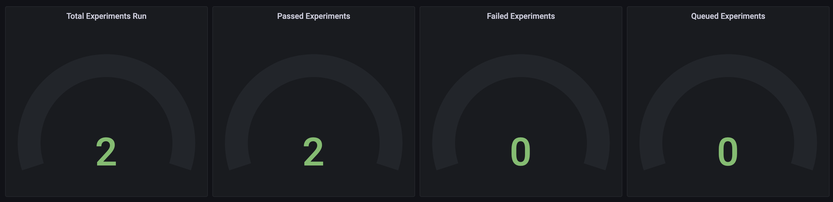 Metrics from chaos-exporter like litmuschaos_passed_experiments, litmuschaos_failed_experiments and litmuschaos_awaited_experiments when ingested in Prometheus which is connected as a data source can provide an aggregated view of chaos injections on a chaos delegate cluster or namespace.